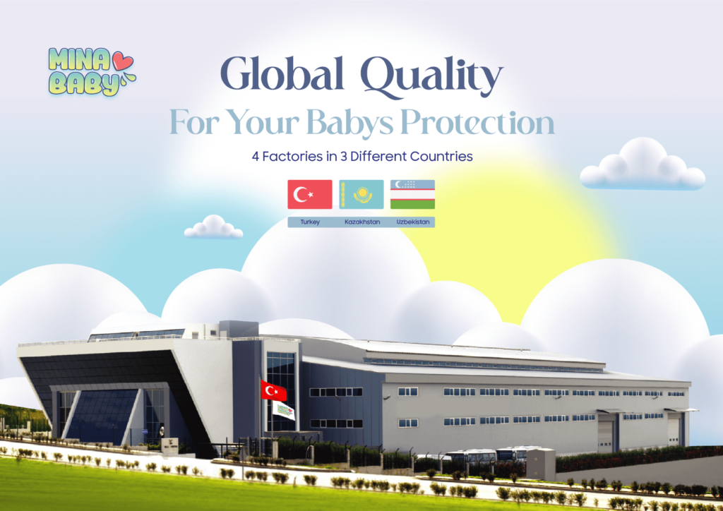 At “Mina Baby,” we are committed to providing pioneering solutions for baby care through a range of high-quality products that combine comfort and safety at every moment. Using innovative materials and advanced technologies, we design diapers and products that fully meet the needs of both mothers and children. We believe in the importance of blending safety and comfort with innovation to ensure a unique experience for the child. In addition to exporting our products to over 50 countries around the world, we operate 4 factories in 3 different countries (Turkey, Kazakhstan, Uzbekistan), allowing us to meet the needs of diverse markets quickly and efficiently. At “Mina Baby,” we are dedicated to delivering the highest quality standards to ensure the comfort and well-being of children worldwide.